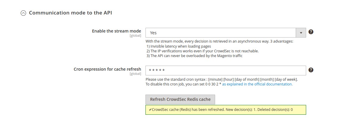 Communication mode to the API β†’ Cron expression for cache refresh (global scope)